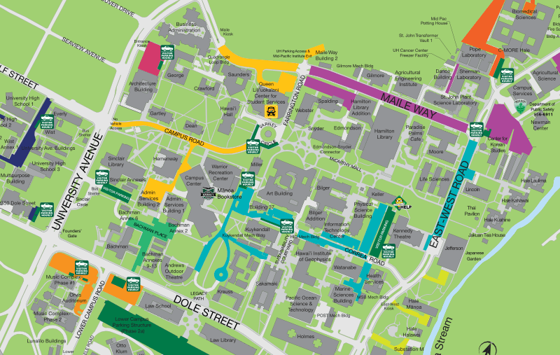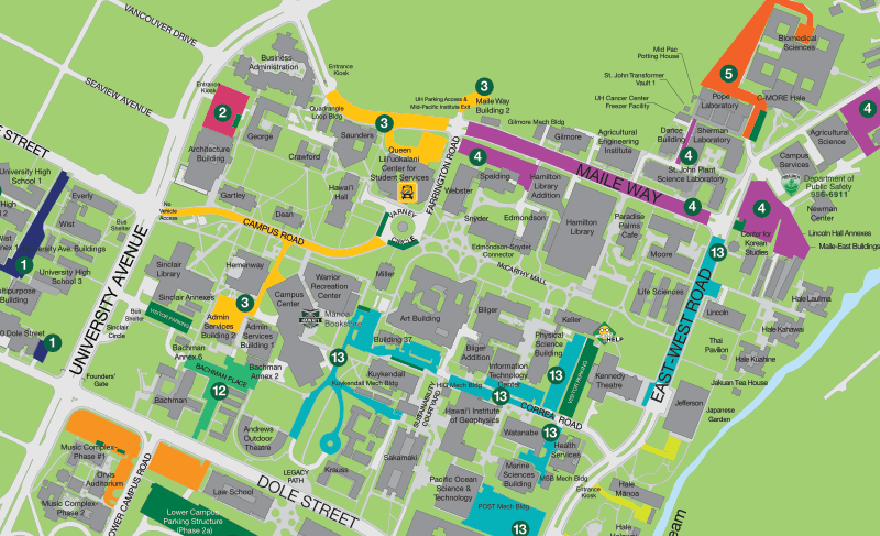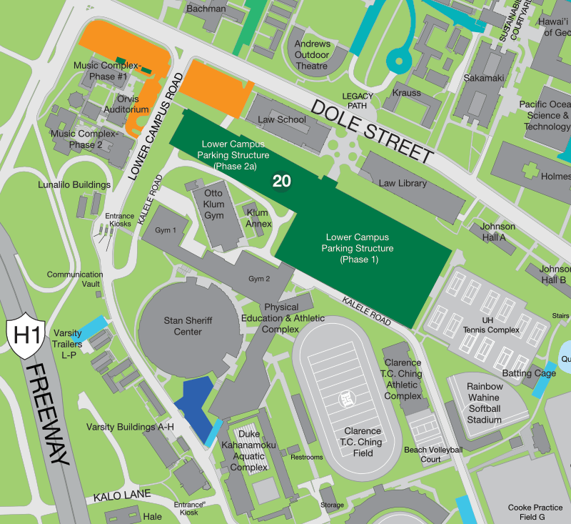 Semester permits offer a lower daily cost for parking for those that need to come to campus more than 3 days a week. Permits are available in Zone 20 - Lower Campus parking structure, Zone 22 - Hawaiʻian Studies parking structure, Zone 8 Hale Aloha and Noelani lots (student housing residents only), and Zone 21 Hale Wainani (student housing residents only). Refer to map at right.